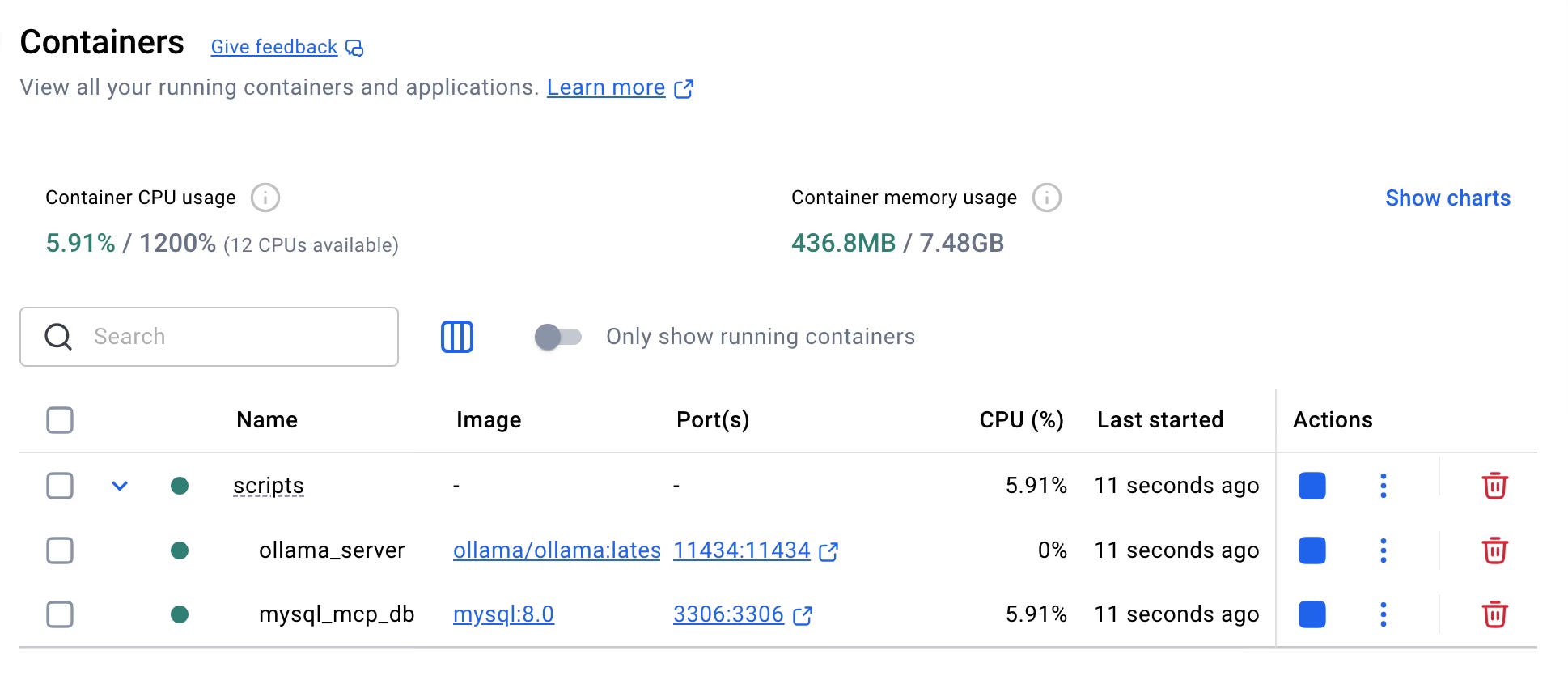 Using the below command, create the necessary containers for MySQL8 and Ollama.